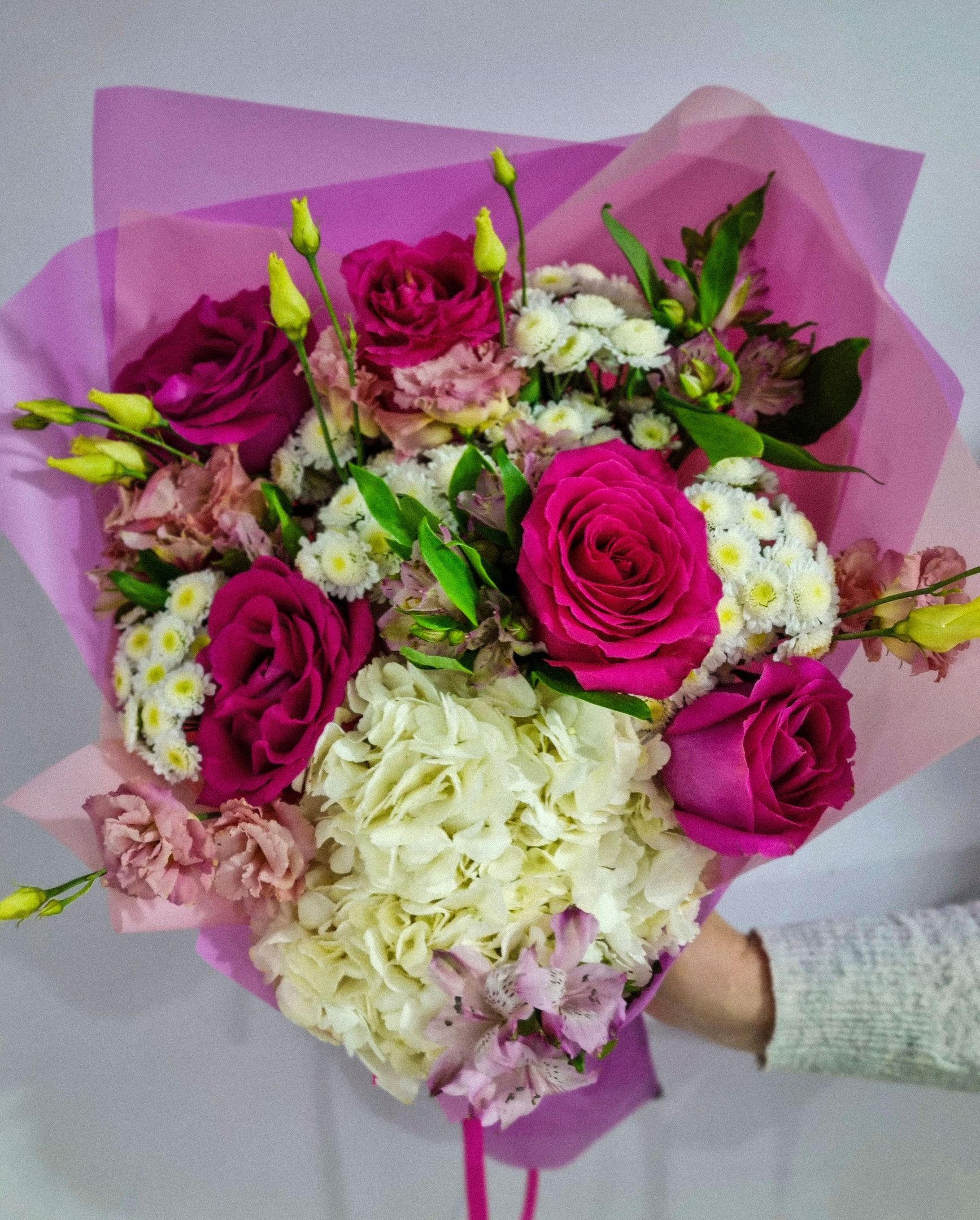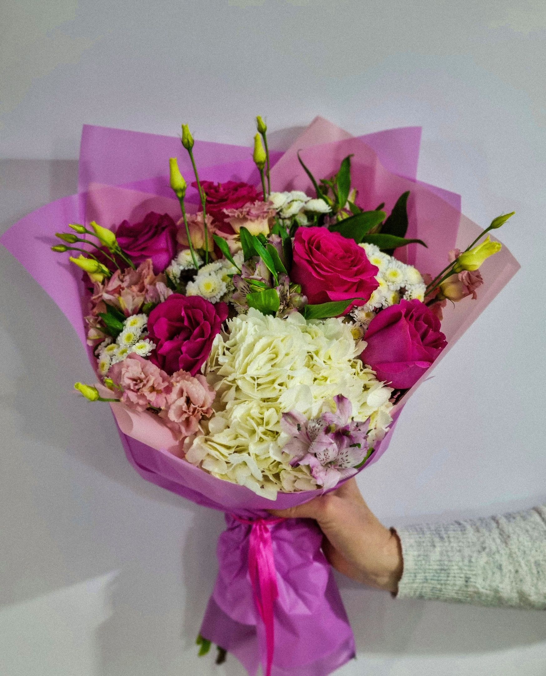 Букет из: кустовой хризантемы, роз, эустомы, альстромерии, гортензии.
