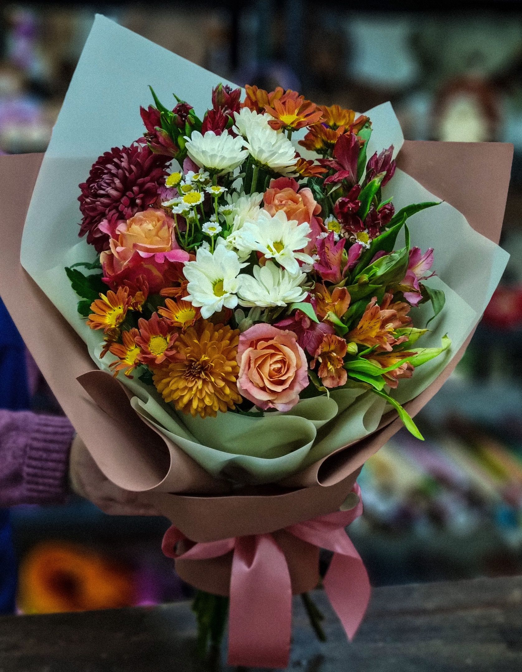 Букет из: одноголовой хризантемы, сантини, кустовой хризантемы, роз, альстромерии.