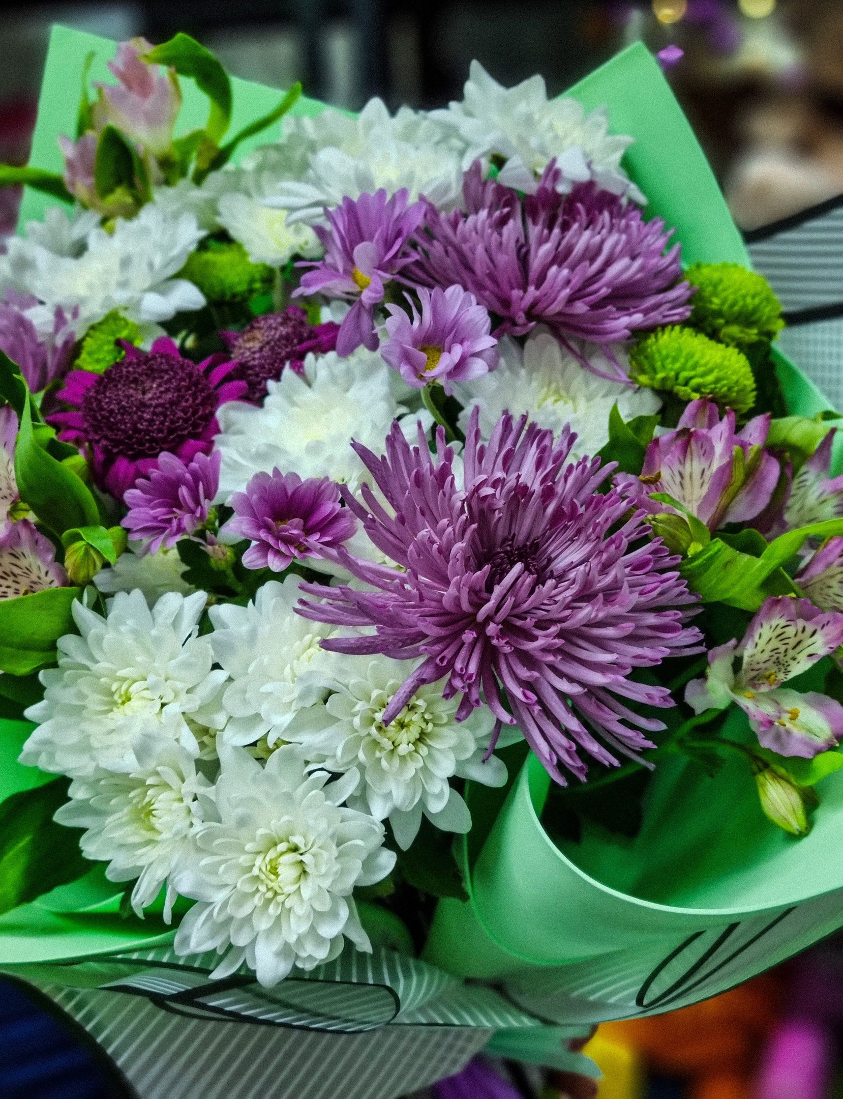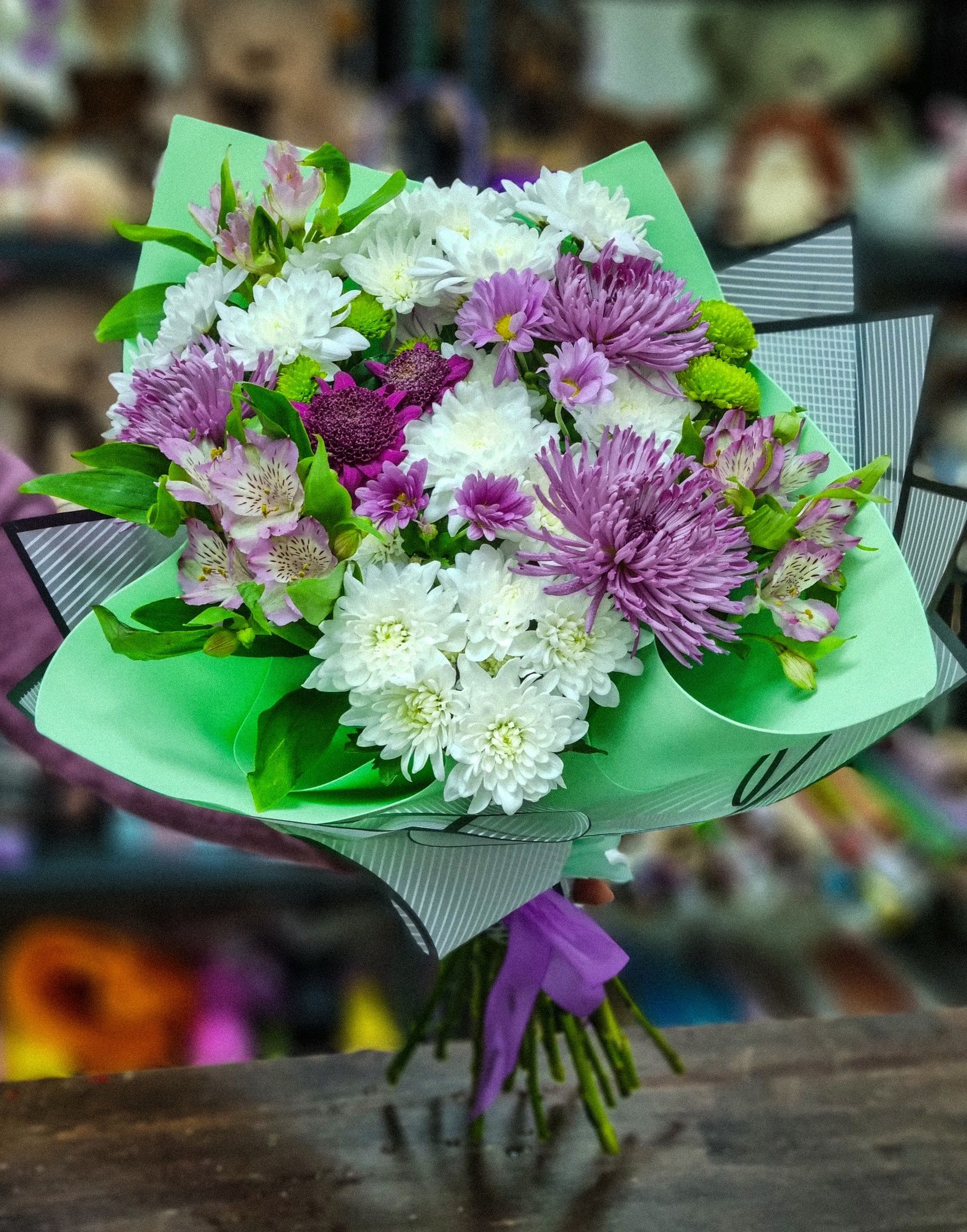 Букет из: кустовой хризантемы, альстромерии, одноголовой хризантемы.
