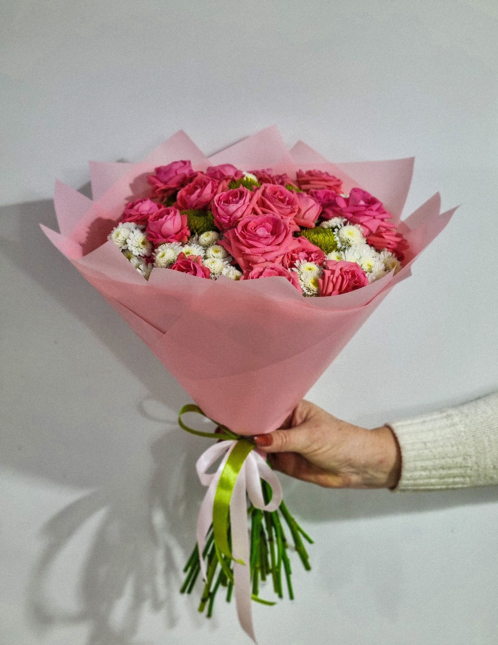 Букет из кустовой розы и кустовой хризантемы.