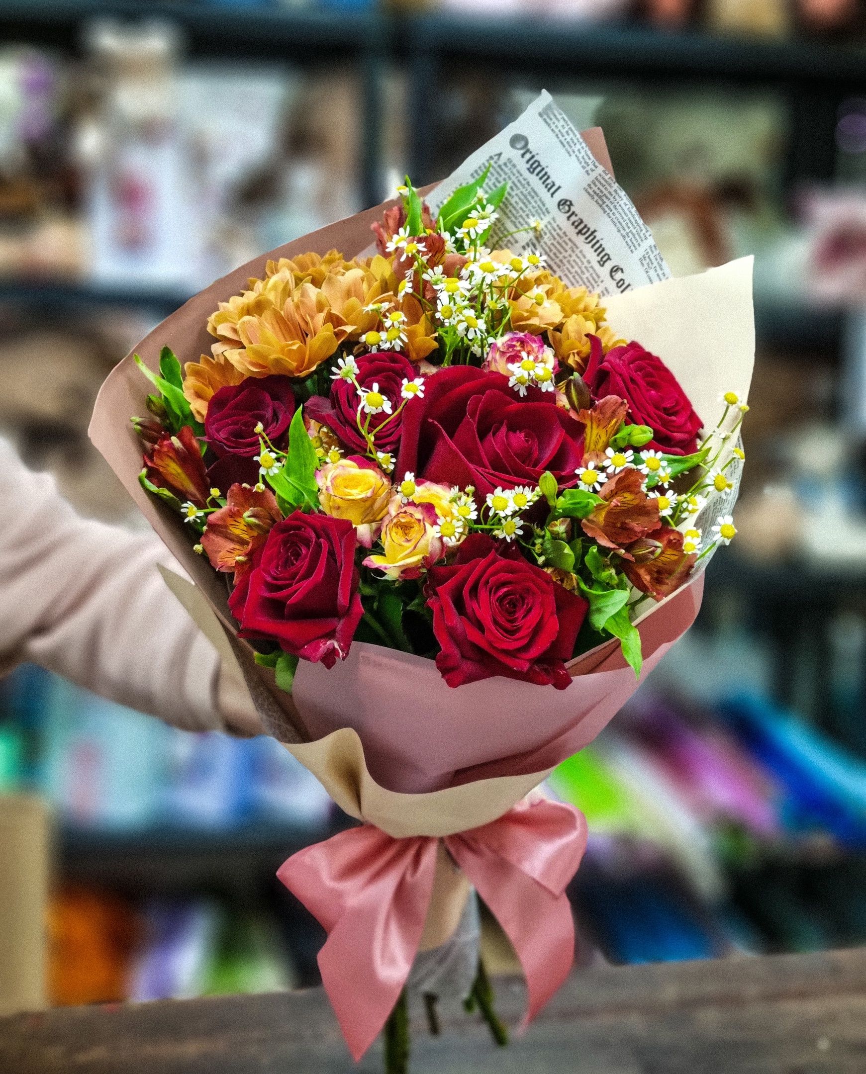 Букет из: кустовой розы, альстромерии, роз, кустовой хризантемы, танацетума.