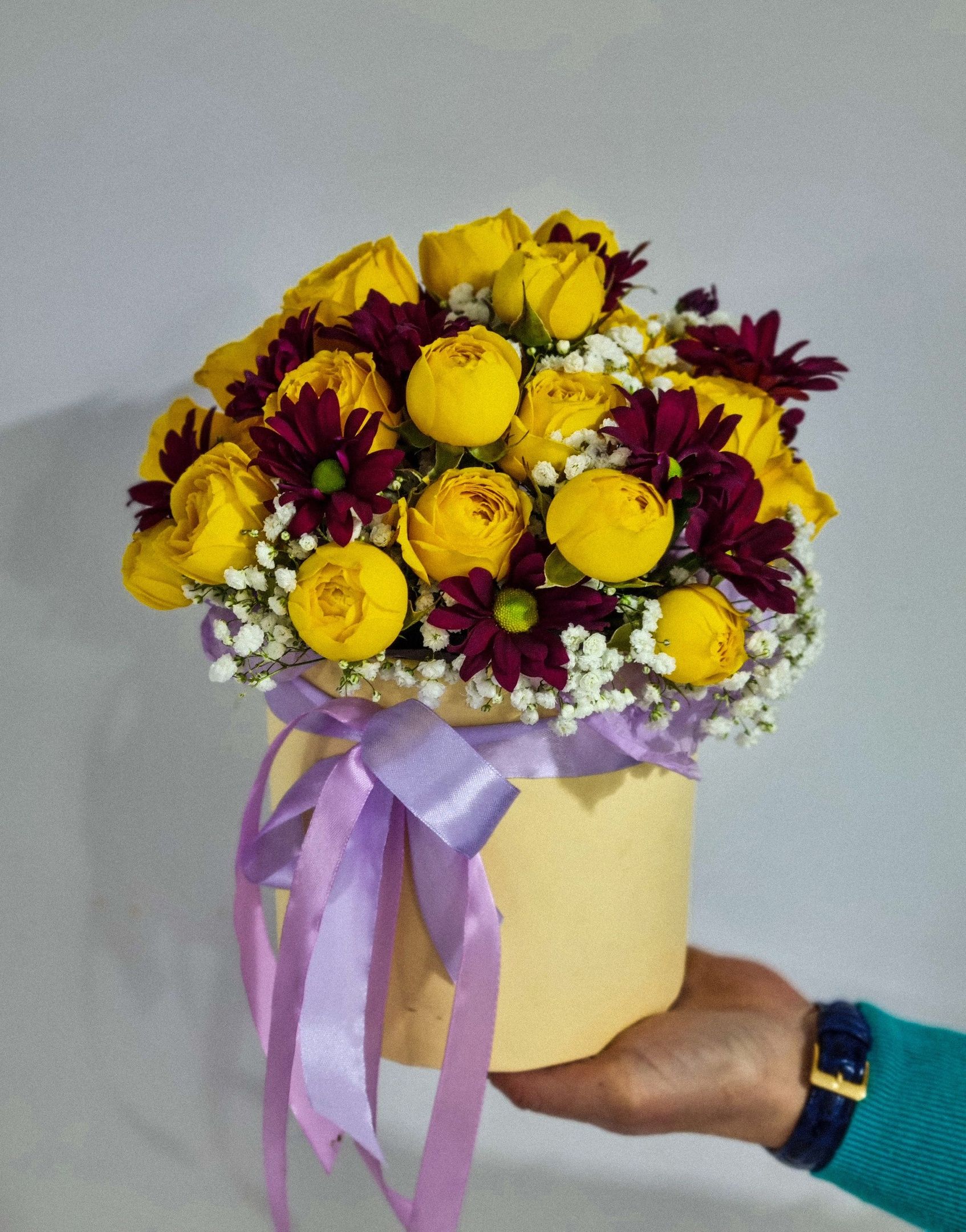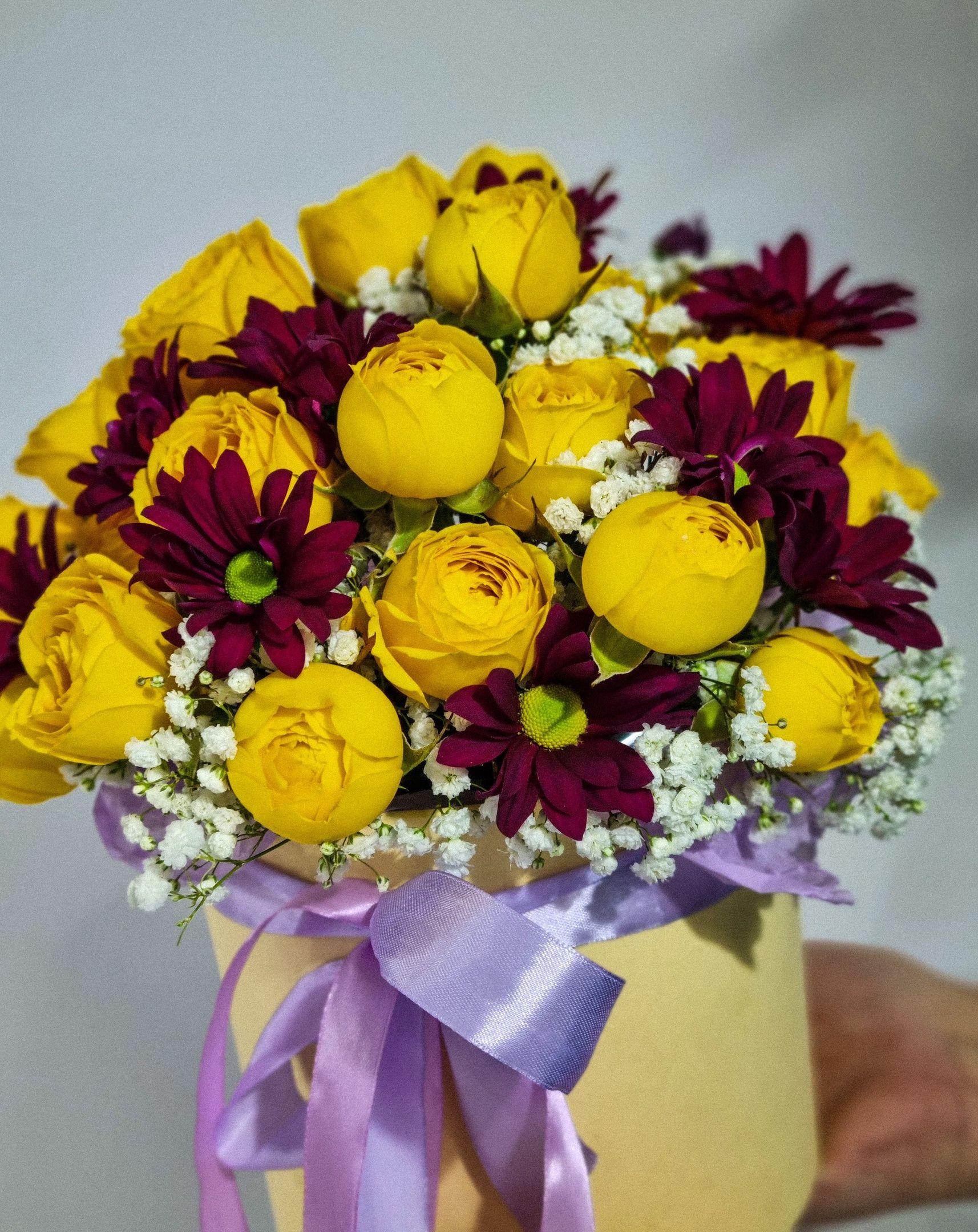 Композиция из: кустовой хризантемы, кустовой розы и гипсофилы.