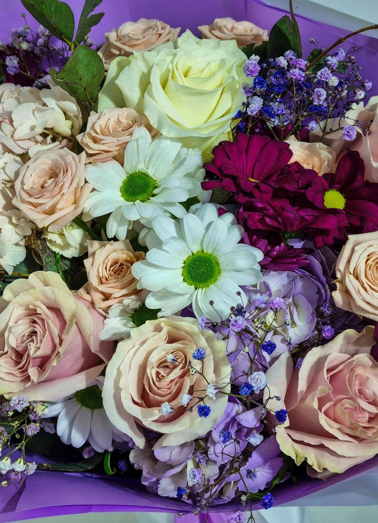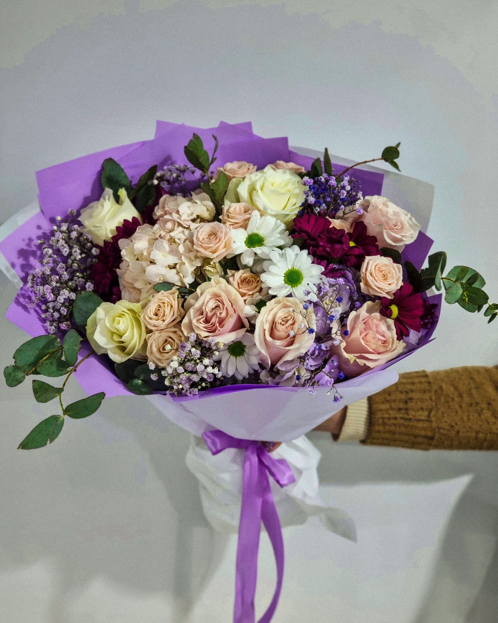 Букет из: роз, кустовой хризантемы, гипсофилы, гортензии, кустовой розы.