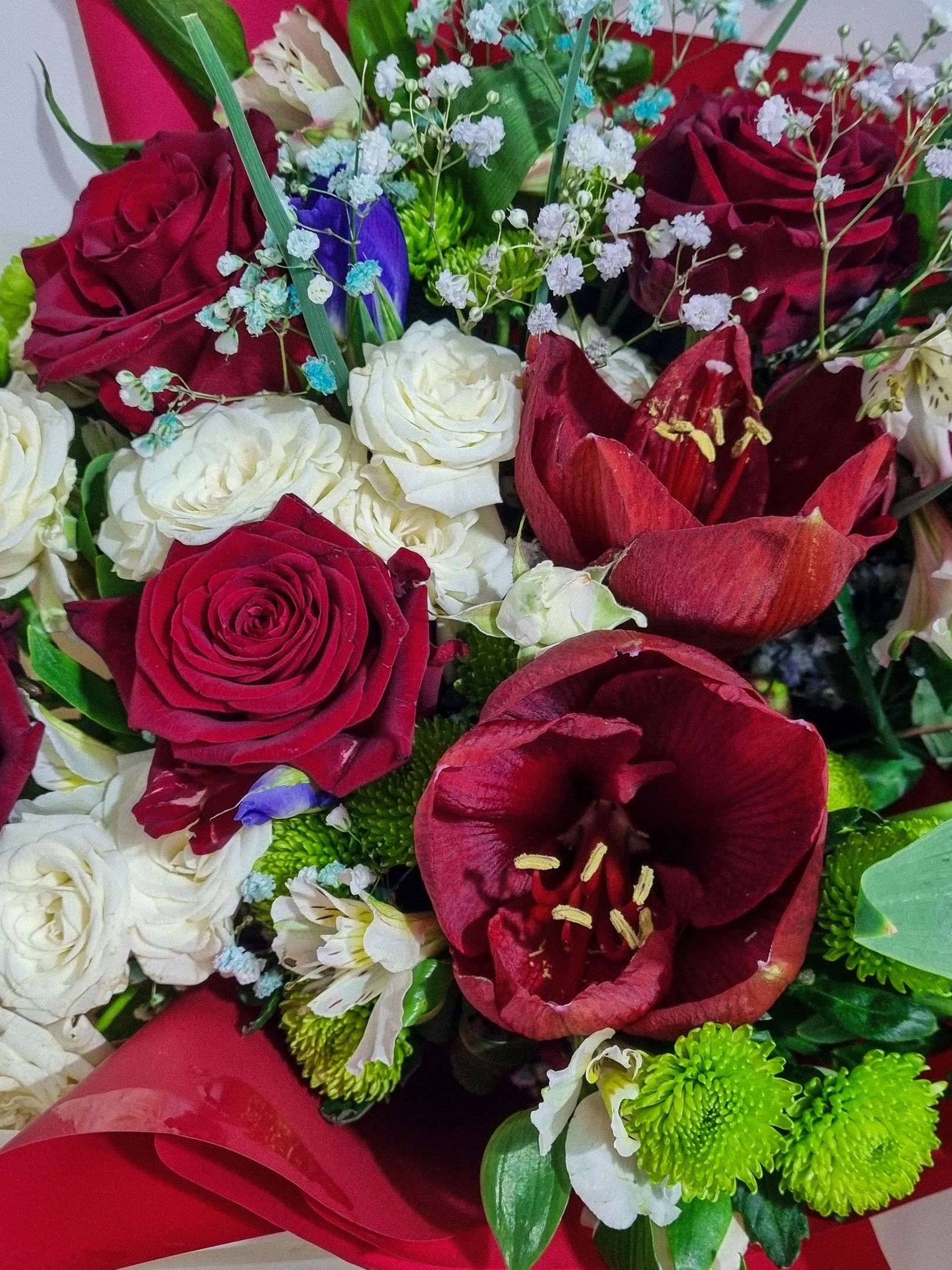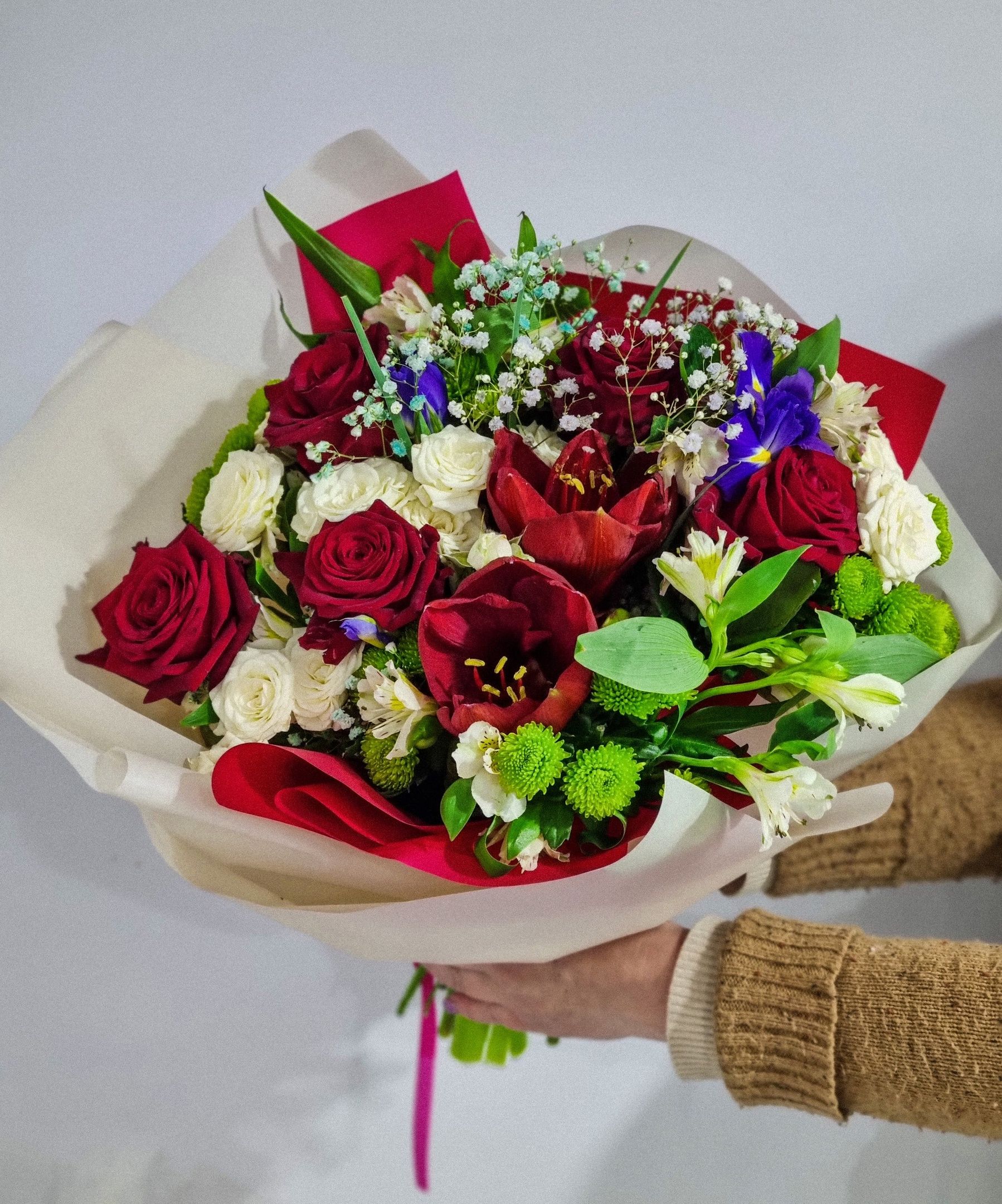 Букет из: кустовой розы, гипсофилы, роз, ирисов, альстромерии, кустовой хризантемы.