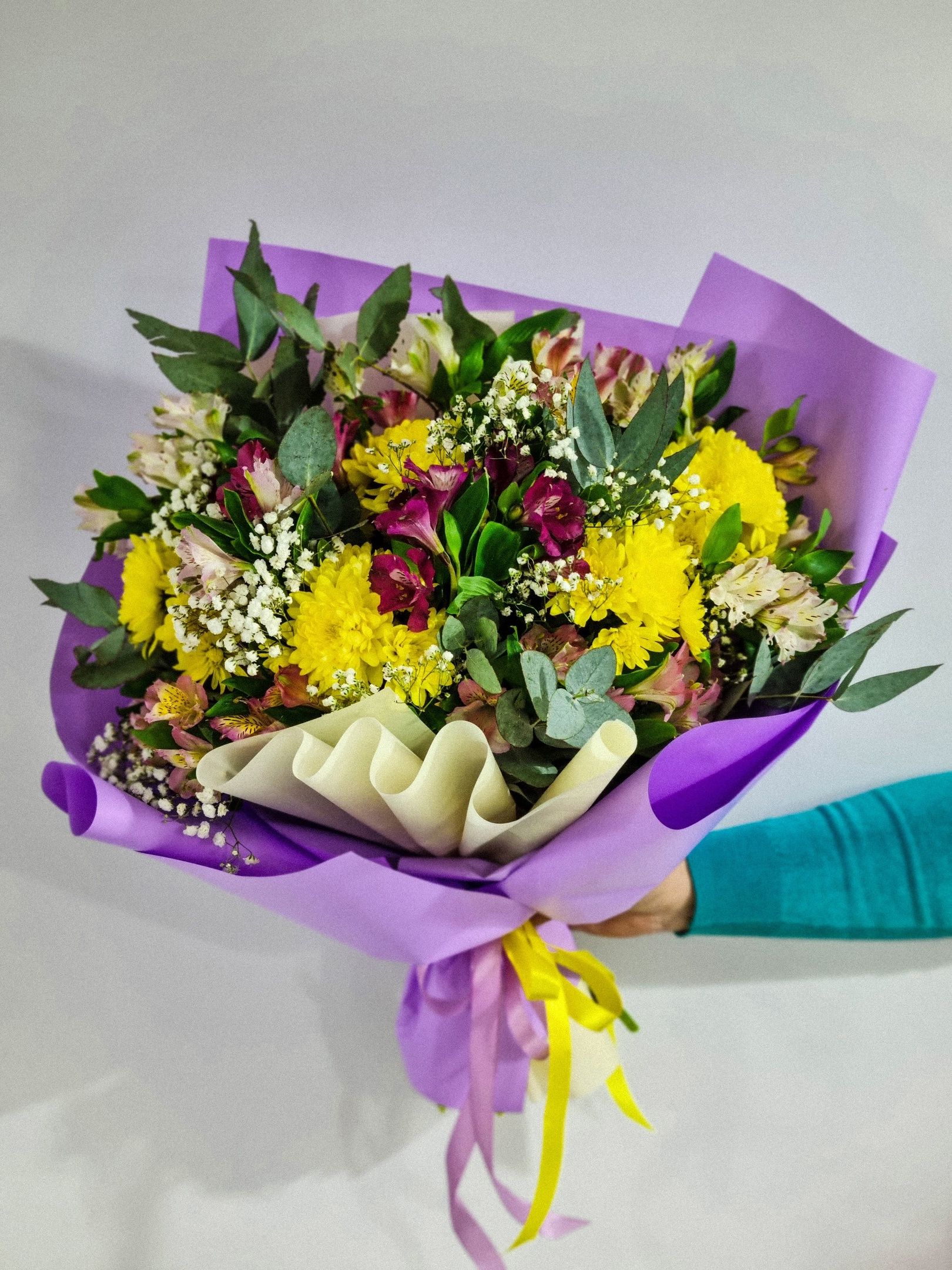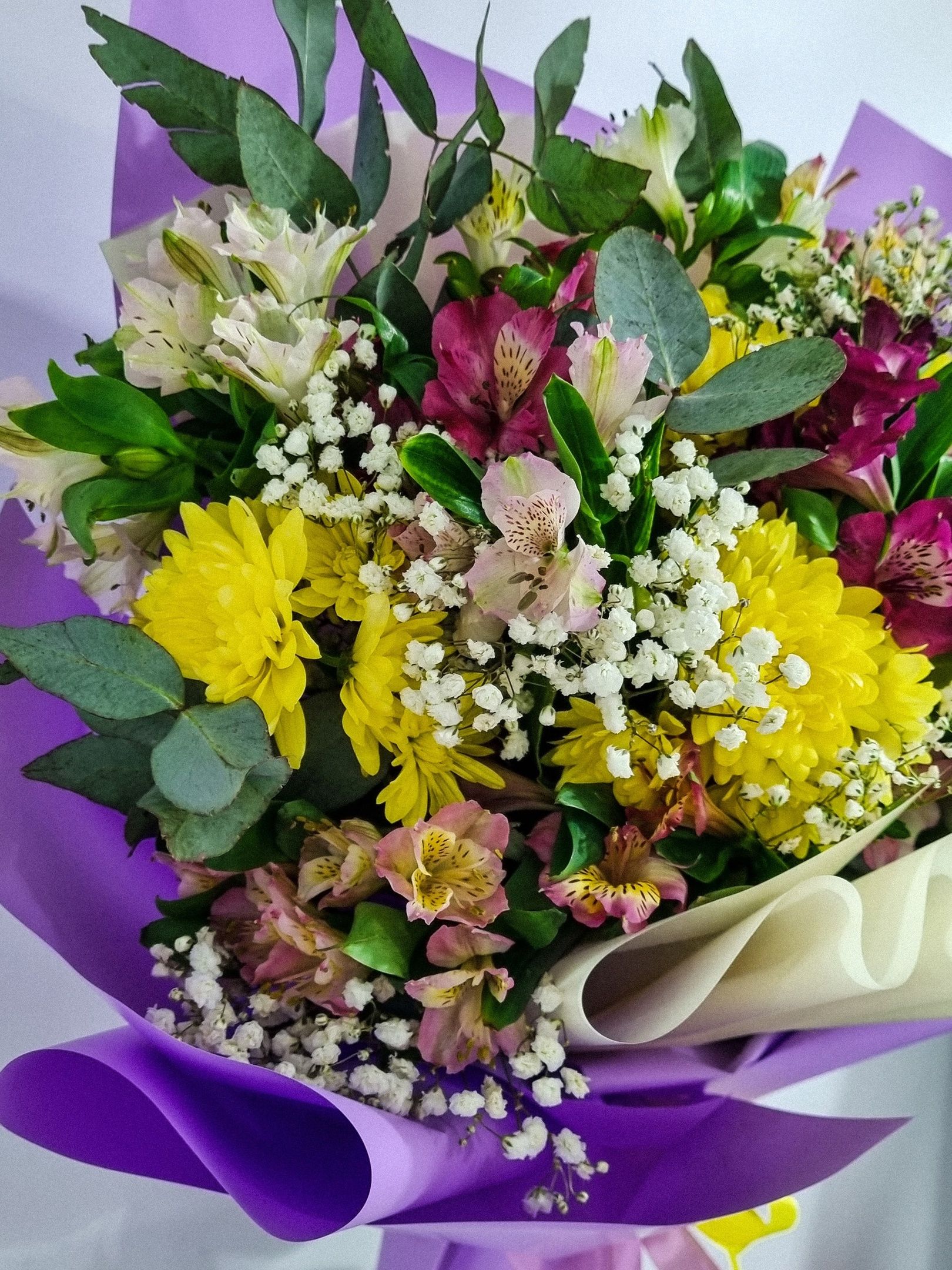 Букет из: альстромерии, гипсофилы, кустовой хризантемы, эвкалипта.
