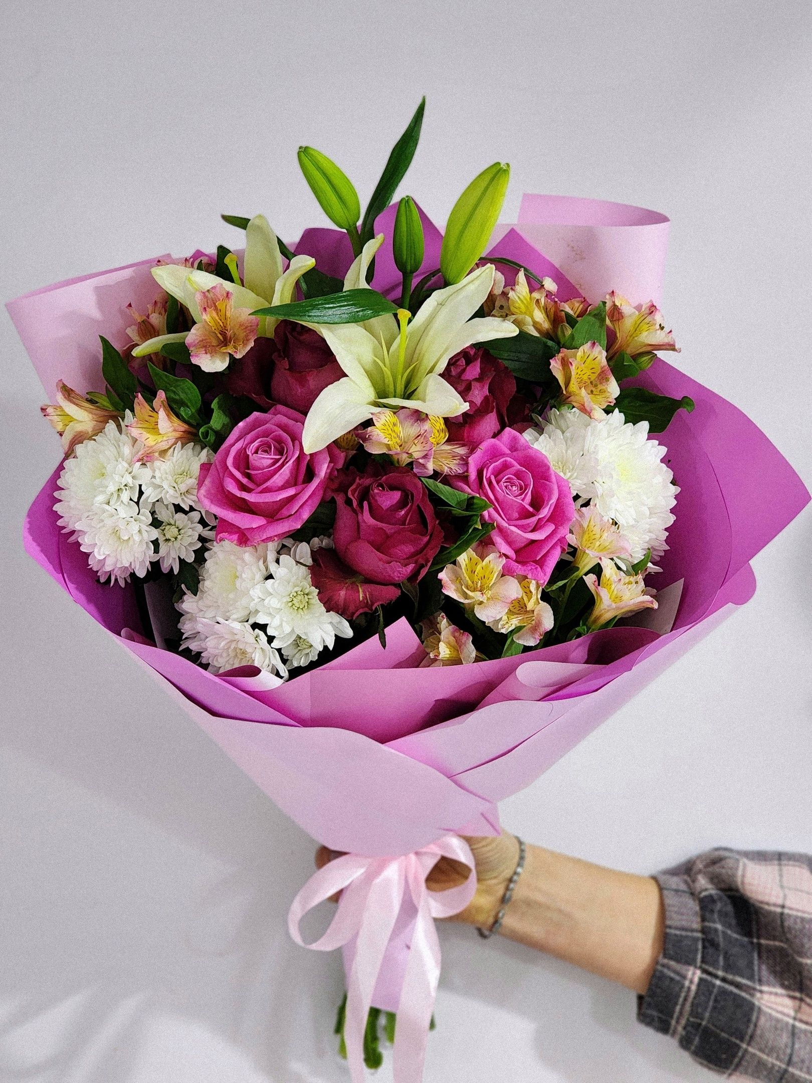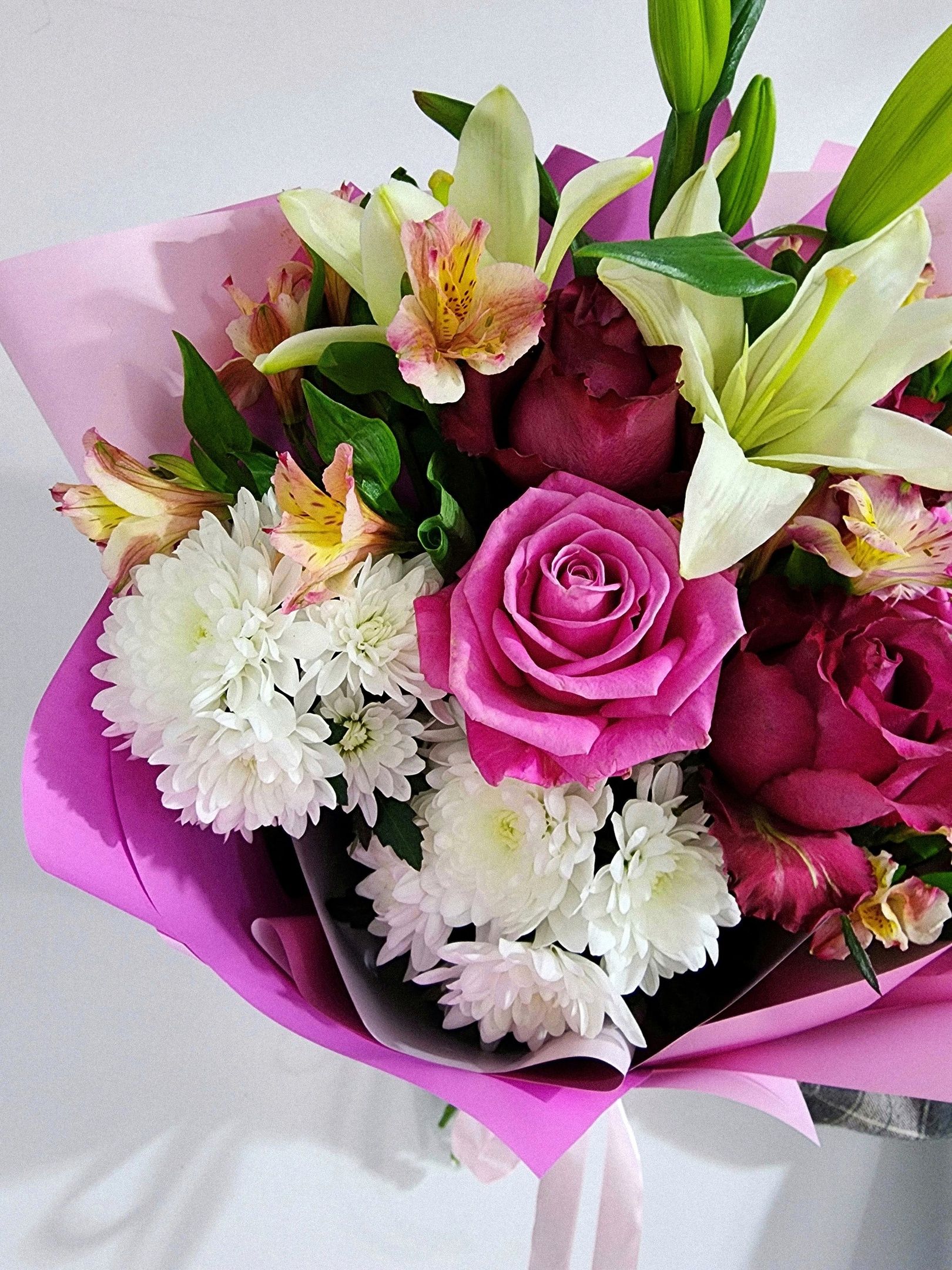 Букет из: роз, кустовой хризантемы, лилий, альстромерии.