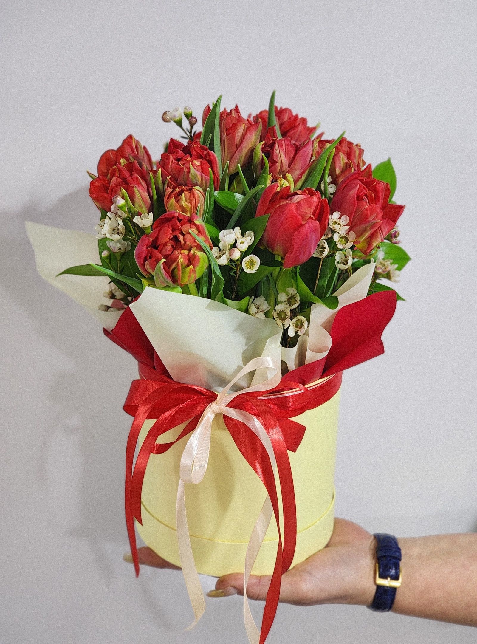 Композиция из тюльпанов и ваксфлауэра.