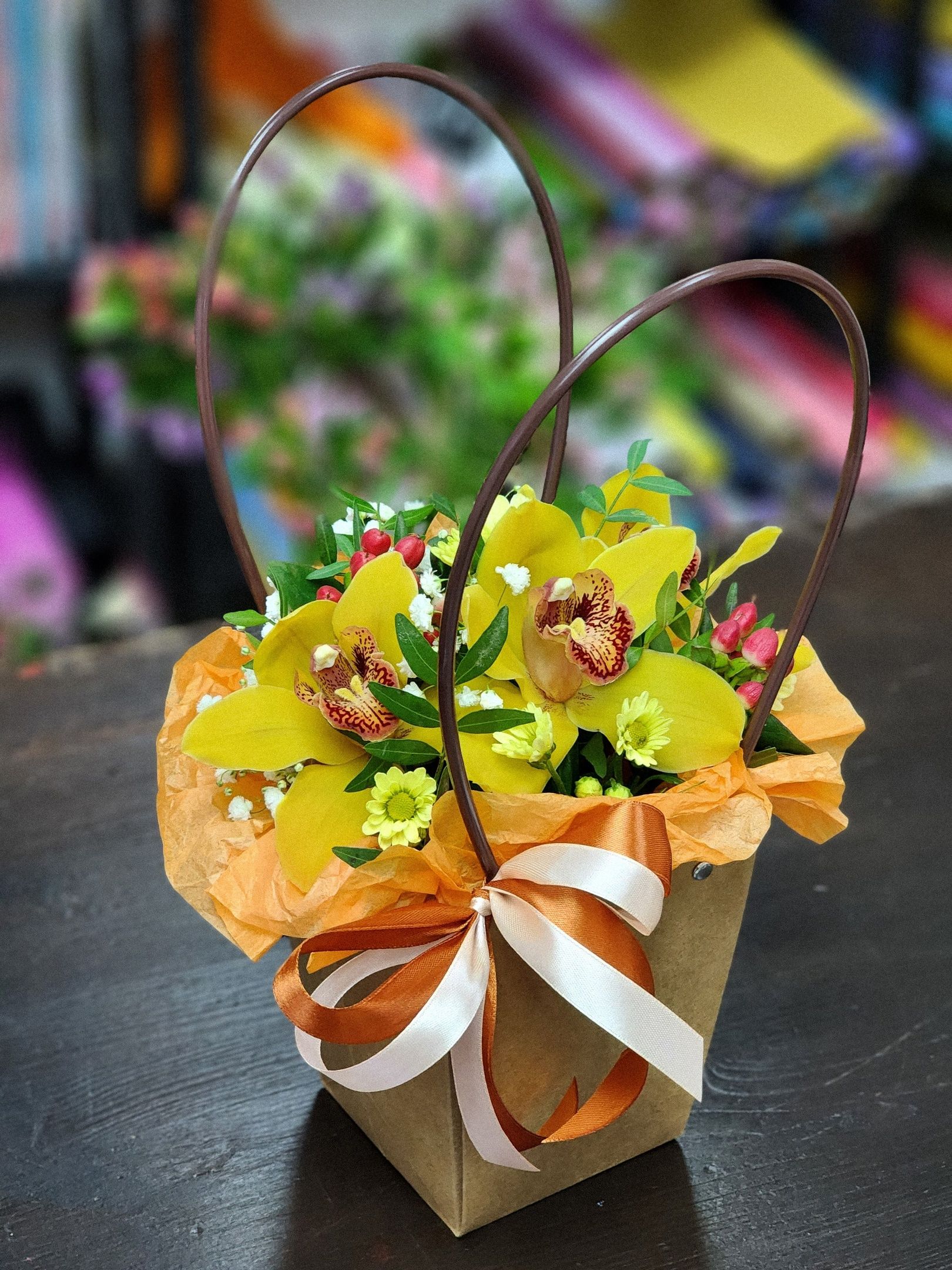 Композиция из: цимбидиума, сантини, гиперикума, гипсофилы.