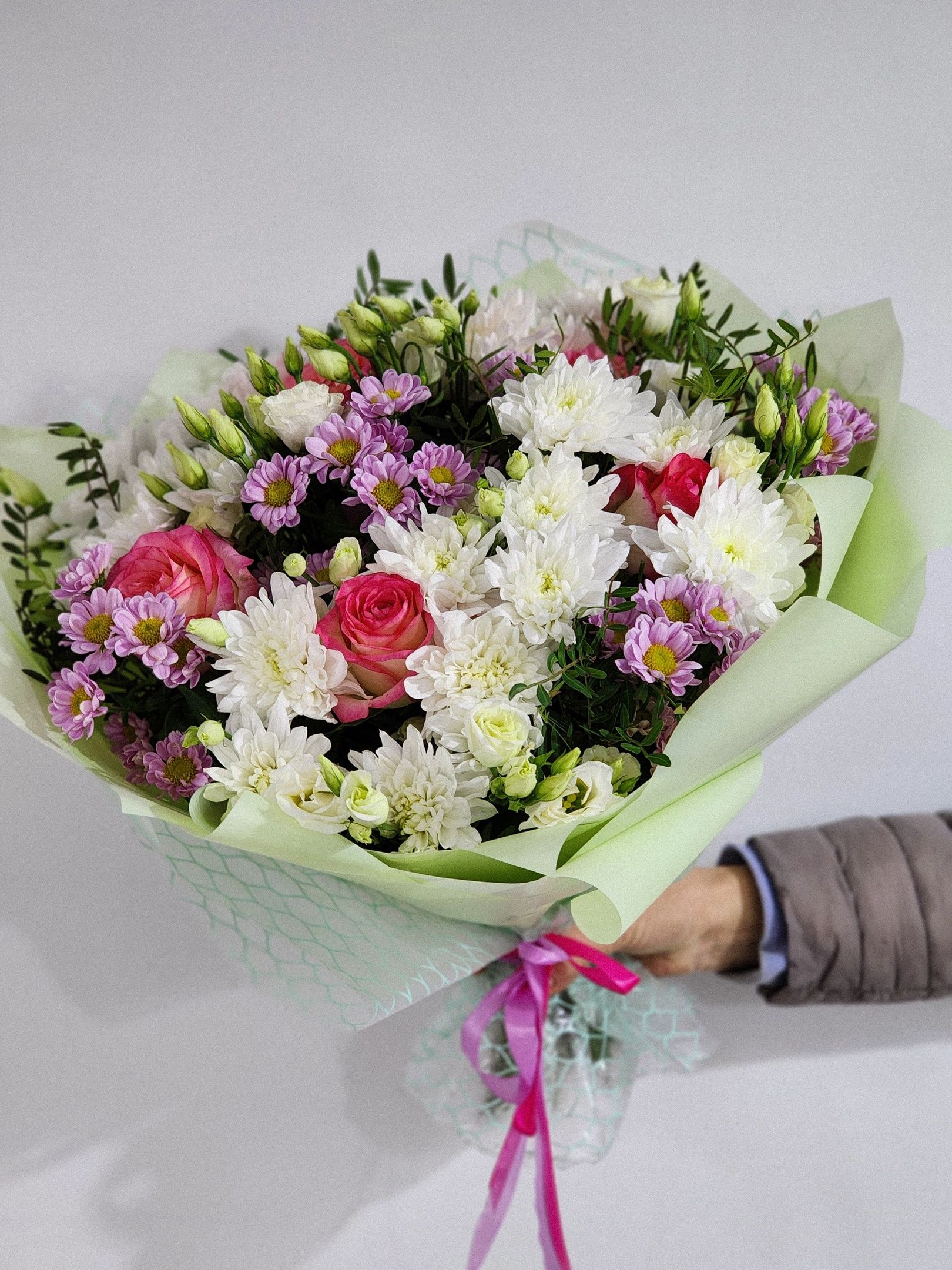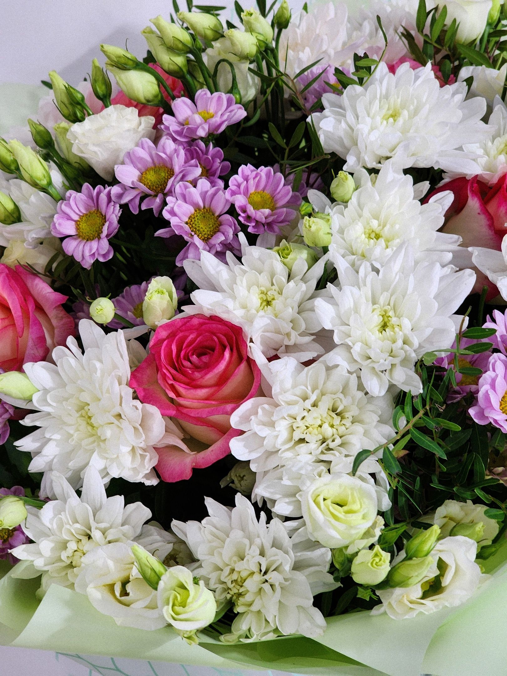 Букет из: роз, кустовой хризантемы, эустомы, сантини.